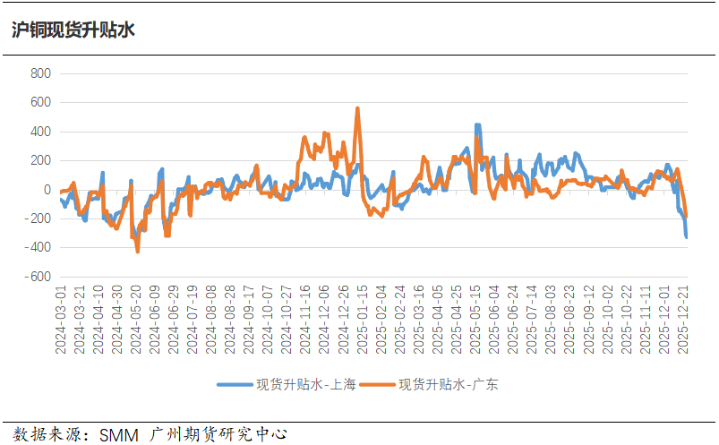 此外,高铜价对淡季阶段需求的负反馈更加明显,12月25日上海铜贴水幅度已扩至330元,广东铜贴水185元。同时国内铜社库持续累库,SMM社库周四增至19.36万吨,较去年年底多出约9万吨。现实需求的疲弱可能对纪录涨势的铜价形成高位调整压力。
