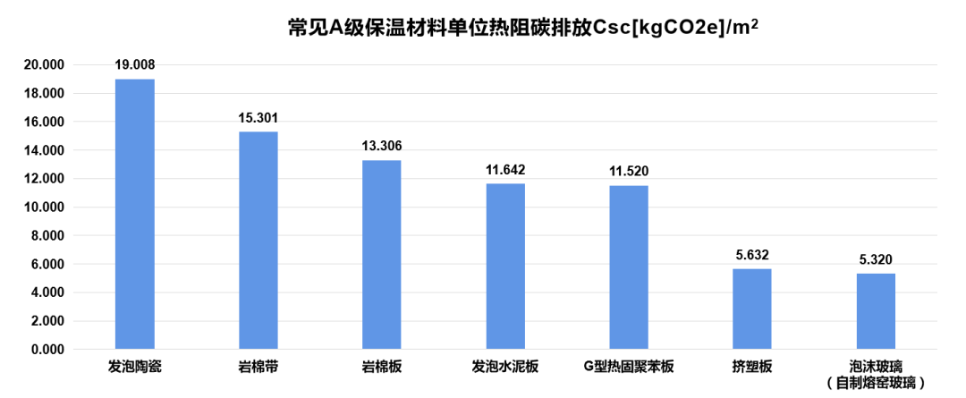 泡沫玻璃以废旧玻璃为主要原材料,从原材料到成品加工过程少,产业链短。结合容重轻和导热系数低的优点,达到相同的保温效果情况下,泡沫玻璃的碳排放是常见A级保温材料中最小的,几乎和有机保温材料碳排放相当。