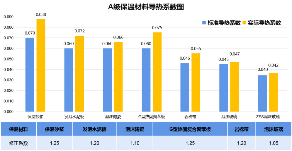 修正系数考虑了实际使用环境和试验室环境不同,给保温性能带来的不利影响。吸水率低的保温材料修正系数低,吸水率高的材料修正系数也高。泡沫玻璃吸水率超低,只有0.5%,因此其修正系数较低,仅为1.05。是常见保温材料里最低的。