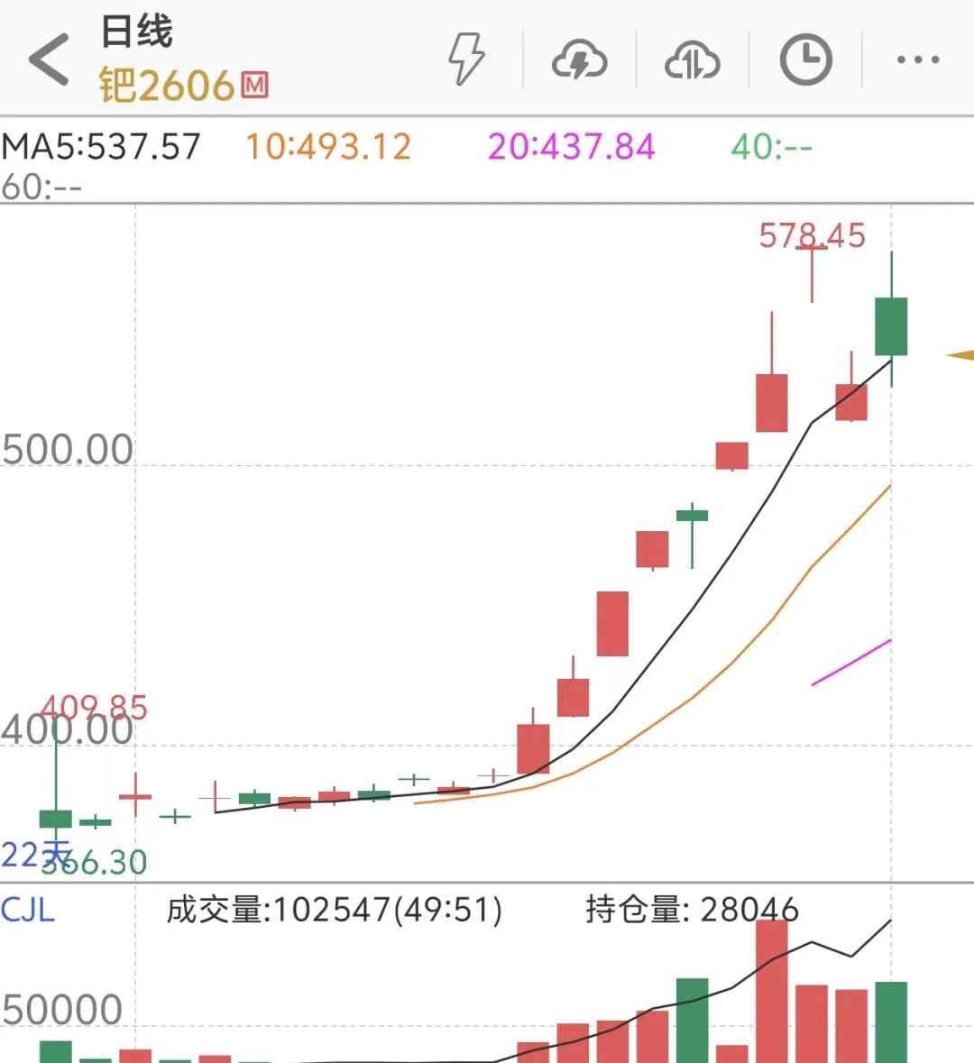 12月26日上午,铂、钯期货价格呈现高位震荡走势。其中,铂期货主力2606合约开盘不久迅速涨停,随后涨停板打开,上午收盘报701.20元/克,涨幅为8.65%;钯期货主力2606合约盘初快速走高,涨幅一度超9%,随后涨幅收窄,上午收盘报539.35元/克,涨幅为2.42%。