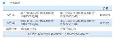 从本例可见,正向市场上,价差是否缩小决定了套利是否成功。对燃料 货来说,一般燃料油仓单每个月的持仓成本决定了相邻两个交割月份合约的价差。 同一燃料油生产年度内的两个相邻月份的合约,如果较远期月份合约与较近期月份 合约的价差大于持仓成本,预计将来价差回归至持仓成本,那么卖远期月份的同 时,买近期月份合约也可以获利,且价差越大,风险越小,获利空间越大。