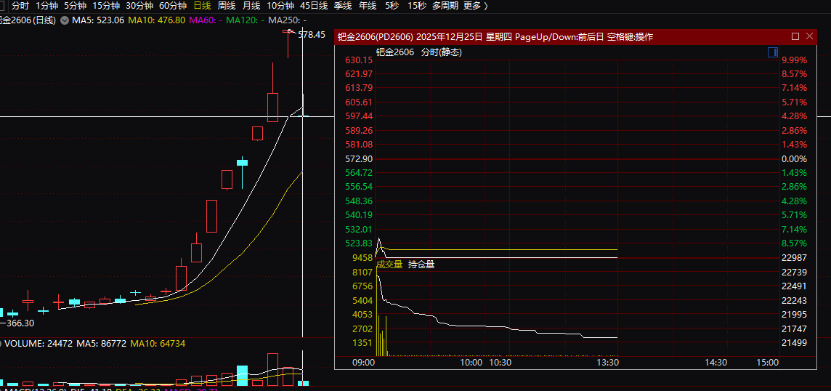行情数据显示,广期所钯期货主力合约今天上午盘中跌停,跌幅达9.99%,这是广期所钯期货上市以来首次盘中跌停。在此之前,该期货品种已连续9个交易日上涨,其中多个交易日收盘涨停。