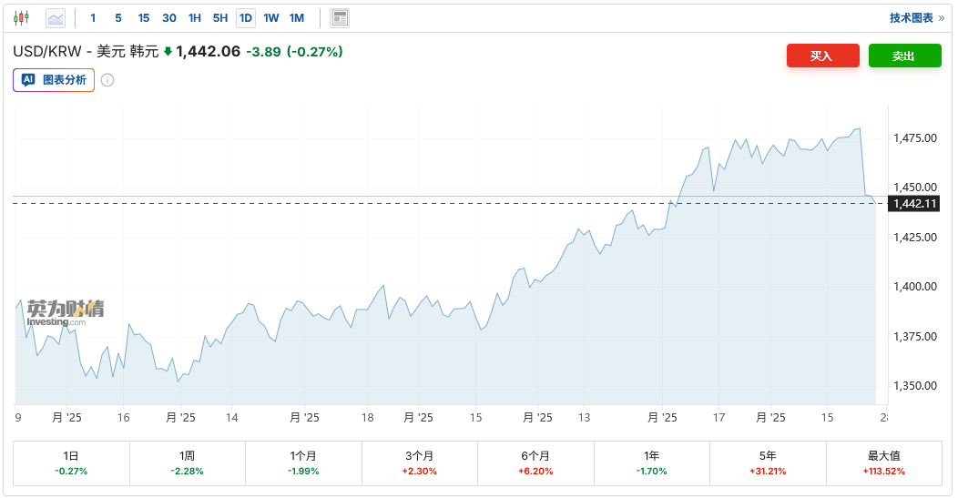 在韩国当局近日就捍卫本币表达“坚定决心”后,韩元周五延续涨势,韩元兑美元汇率升至11月初以来的最高水平。截至发稿,美元兑韩元汇率跌0.27%,报1442.06,日内一度跌至1429.82。该汇率过去一周已下跌2.28%。