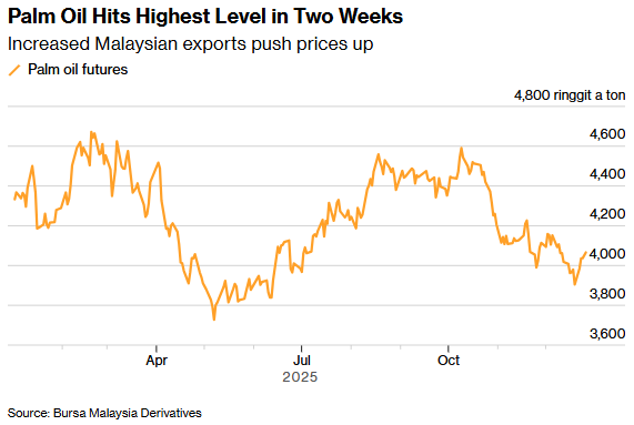 棕榈油价格连续第四个交易日上涨,并在马来西亚产品需求增加的支撑下触及两周以来最高水平。