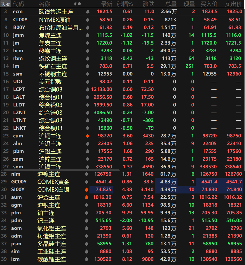 贵金属方面,截至15:08分,COMEX黄金涨0.86%,盘中最高冲至4561.6美元/盎司,继续刷新其上市以来的历史新高;COMEX白银涨4.38%,盘中最高冲至75.495美元/盎司,同样刷新其历史高位。国内方面,沪金涨0.75%,盘中最高冲至1023.96元/克的历史新高,沪银涨6.6%,盘中最高冲至18658元/千克,同样刷新其历史记录!