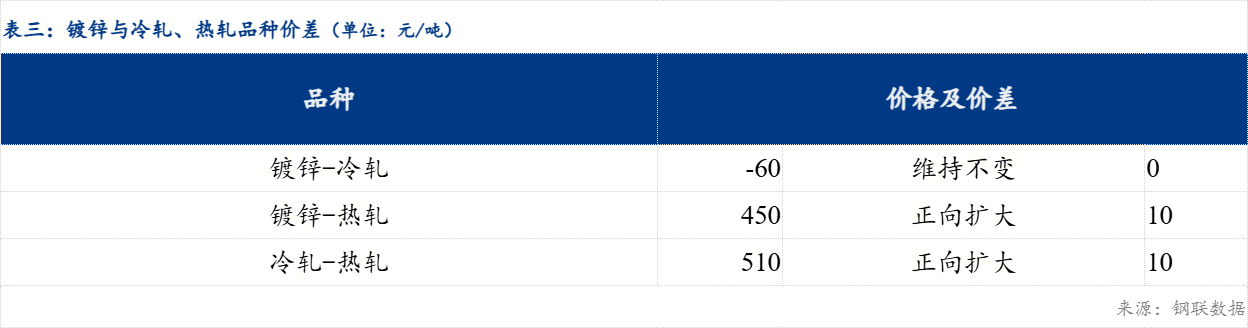 区域价差来看,天津-沈阳冷轧板卷区域价差维持不变,沈阳-哈尔滨冷轧板卷区域价差维持不变;天津-沈阳镀锌板卷区域价差维持不变,沈阳-哈尔滨镀锌板卷区域价差缩扩大10元/吨。品种价差来看,镀冷品种价差扩大10元/吨;镀热品种价差维持不变;冷热品种价差扩大10元/吨。