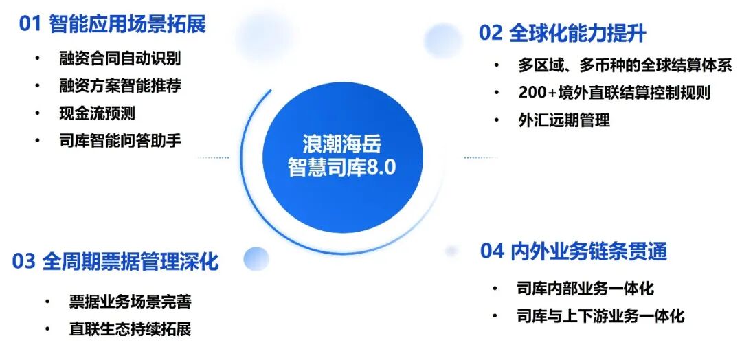 浪潮海岳智慧司库管理8.0以智能化应用拓展、全球化结算网络完善、全周期票据管理深化、内外业务链条贯通为依托,打造智能、立体、全球化金融资源运作平台,赋能企业司库数智化转型升级。