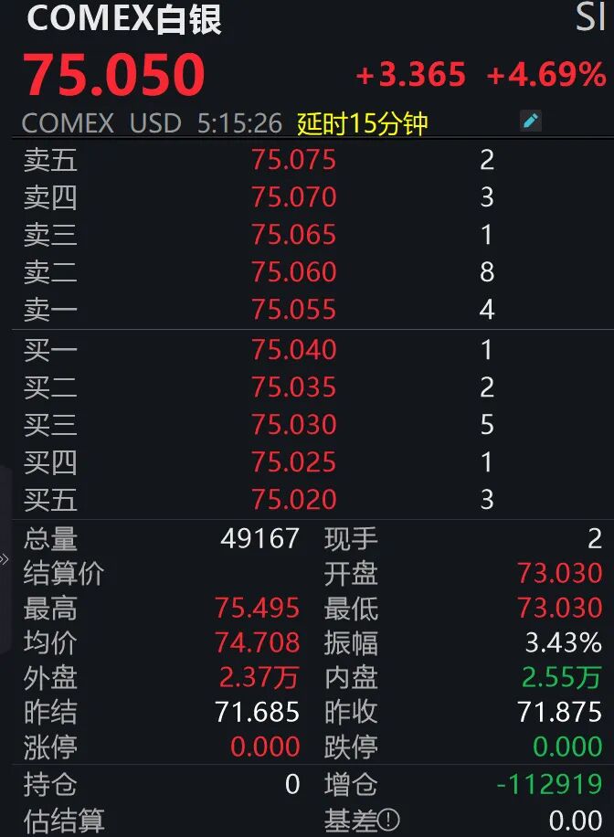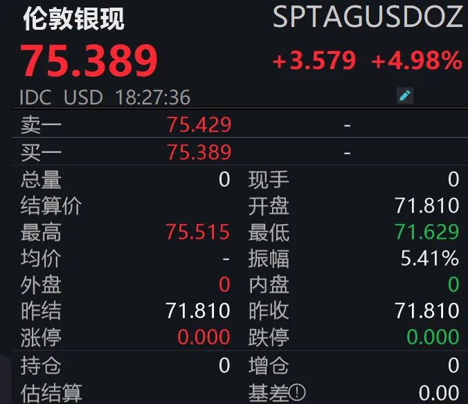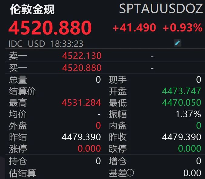 现货市场上,截至记者发稿,伦敦金现日内涨幅0.93%,交投于4520美元/盎司附近,盘中最高触及4531.284美元/盎司,为历史首次;白银表现更为迅猛,伦敦银现报75.389美元/盎司,日内大涨近5%,盘中最高触及75.515美元/盎司,年内涨幅已近150%。