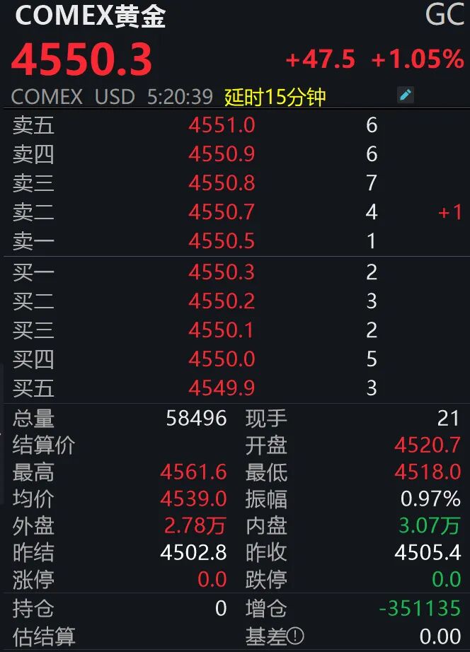 期货市场同步走强,形成期现共振上涨格局。截至发稿,COMEX黄金期货日内上涨1.05%,报4550.3美元/盎司,盘中最高触及4561.6美元/盎司,再度刷新历史纪录;COMEX白银期货报75.05美元/盎司,最高触及75.495美元/盎司,年内涨幅已逼近160%。
