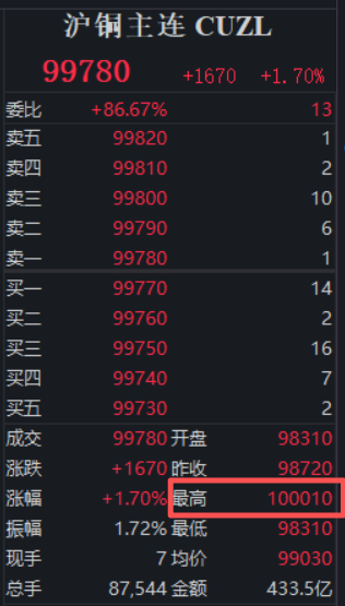 沪铜期货主力,破十万!