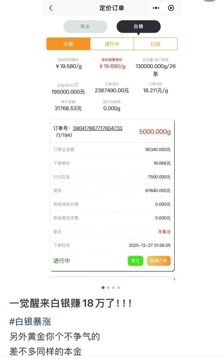 随着白银上演史诗级行情,有人在社交媒体发文称,一觉醒来赚了18万元,黄金不争气......
