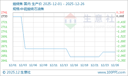 据生意社商品分析系统显示,本周地炼石油焦行情大幅回落,截止到12月26日山东市场地炼石油焦价格为2540.75元/吨,较12月22日2443.25元/吨上涨3.99%。