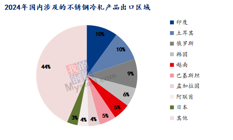国内不锈钢冷轧出口占比较高,2024年该量约284.4万吨,约占国内出口总量的56.7%。