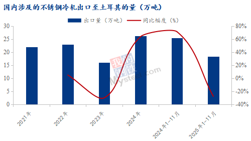 2025年1-11月,国内涉及的不锈钢冷轧出口土耳其的累计量约18.3万吨,同比减少7.1万吨,减幅27.9%。