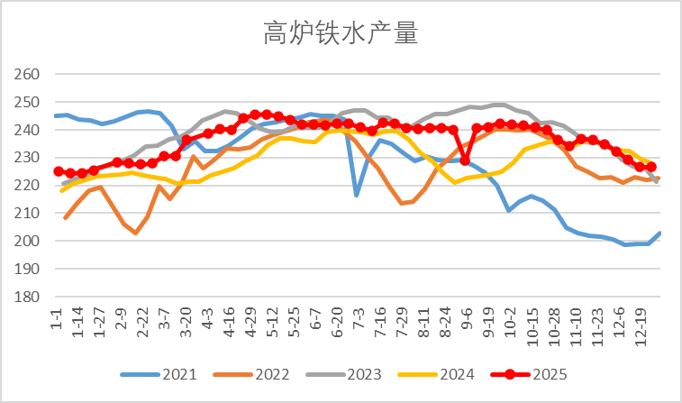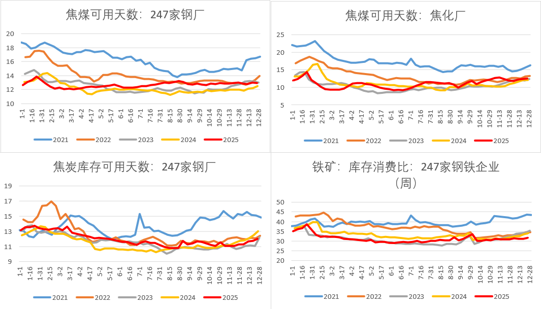 从当前产业基本面来看,黑色品种仍处于“供需双弱”的弱现实格局,这是制约其跟随工业品走强的核心瓶颈。供应端,临近年底,主产区煤矿多已完成年度生产任务,炼焦煤供应边际收紧,环保与安全检查升级进一步限制产能释放;钢厂方面,高炉检修按计划推进,铁水产量持续回落,钢材供应呈小幅下降态势。需求端,成材需求进入季节性淡季,建筑领域开工率下滑导致螺纹钢等主要品种需求疲软,钢厂对原料采购持谨慎态度,焦炭已连续落地三轮提降,累积跌幅达150-165元/吨。