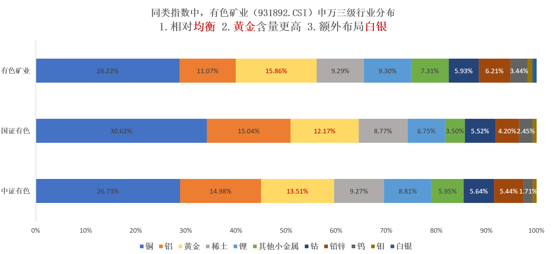 很简单:1.聚焦上游;2.黄金占比多;3.布局了其他指数没有的白银。
