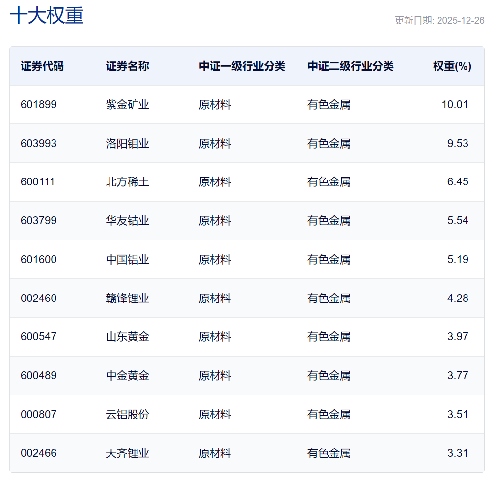想纯粹地吃到“资源重估”的红利,必须精准聚焦最上游,就像有色矿业(931892.CSI)——它的编制规则就是“做减法”,只选“矿主”,谁家资源储量多、谁权重高,比如核心成分股有紫金矿业(铜金)、北方稀土(稀土)、洛阳钼业(钼钴)、华友钴业(钴)……清一色的资源巨头。