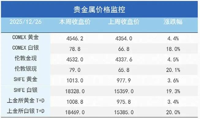 上周贵金属价格表现强势,银价大幅上行,COMEX金银于4367-4584美元/盎司、67.4-79.7美元/盎司区间内运行。上周,海外市场圣诞节休市两日,美国公布的宏观经济数据整体对降息预期影响较小,美联储官员持续发表鸽派表态,海外降息预期仍占主导,美元显著走弱,流动性宽松预期下,贵金属价格大幅走强,其中白银的结构性挤仓逻辑推升伦敦现货白银大幅上涨,波动率处于历史高位。