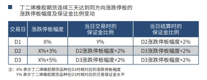当丁二烯橡胶期货某个合约连续三个交易日(即D1、D2、D3交易日)的累计涨跌幅(N)达到12%;或连续四个交易日(即D1、D2、D3、D4交易日)的累计涨跌幅(N)达到14%;或连续五个交易日(即D1、D2、D3、D4、D5交易日)的累计涨跌幅(N)达到16%时,交易所可以根据市场情况,采取单边或双边、同比例或不同比例、部分会员或全部会员提高交易保证金,限制部分会员或全部会员出金,暂停部分会员或全部会员开新仓,调整涨跌停板幅度,限期平仓,强行平仓等措施中的一种或多种措施,但调整后的涨跌停板幅度不超过20%。