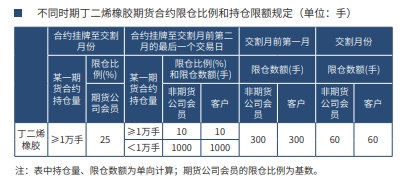期货公司会员、非期货公司会员和客户的丁二烯橡胶期货合约在不同时期的限仓比例和限仓数额具体规定如下: