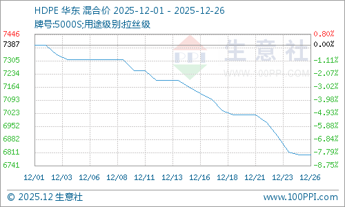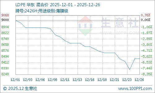 据生意社商品行情分析系统监测,LLDPE(7042)12月1日均价6905元/吨,12月26日均价在6375元/吨,下跌7.68%。LDPE(2426H)12月1日均价9000元/吨,12月26日均价在8466元/吨,下跌5.93%。HDPE(2426H)12月1日均价7387元/吨,12月26日均价在6800元/吨,下跌7.95%。