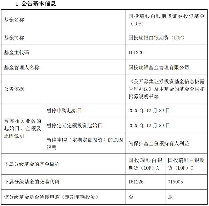 为保护基金份额持有人利益,国投瑞银白银期货证券投资基金(LOF)C类基金份额将从2025年12月29日开始暂停申购。本基金取消或调整2025年12月29日起的暂停C类基金份额申购(含定期定额投资)业务的具体时间将另行公告。