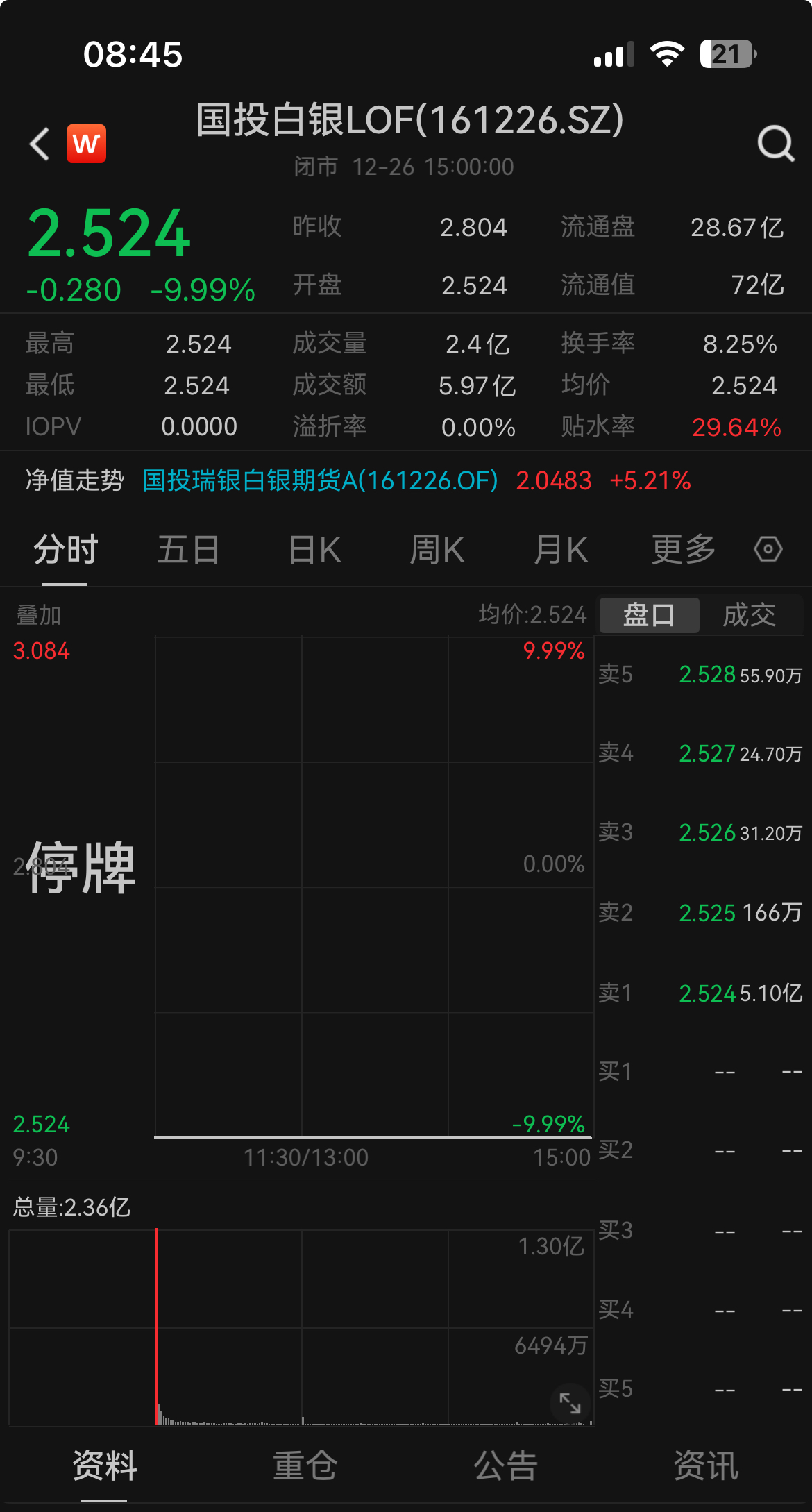12月25日、26日,国投白银LOF场内价格在此前连续3天涨停后,连续两天跌停,26日成交金额近6亿元,溢价率进一步收窄至30%以内。
