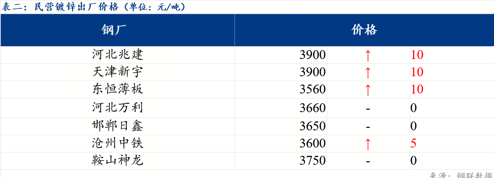 今日北方民营钢厂镀锌出厂指导价在2560-3900元/吨。