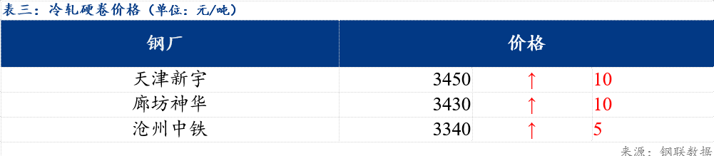 今日北方市场冷轧基料3.0*1010*CSPHC河北普阳价格为3210元/吨,较上一期价格持稳,河北纵横价格为3200元/吨,较上一期价格持稳。镀锌方面,今日北方钢厂指导价格部分上涨5-10元/吨;轧硬方面,当前主流报价3340-3450元/吨。市场方面,热卷期货盘面价格上涨带动现货市场交投氛围,大户日成交500吨,以价换量情况较多,临近元旦假期,贸易商操作上仍以出货为主,心态方面来看,需求释放有限,贸易商多持谨慎心态看待。