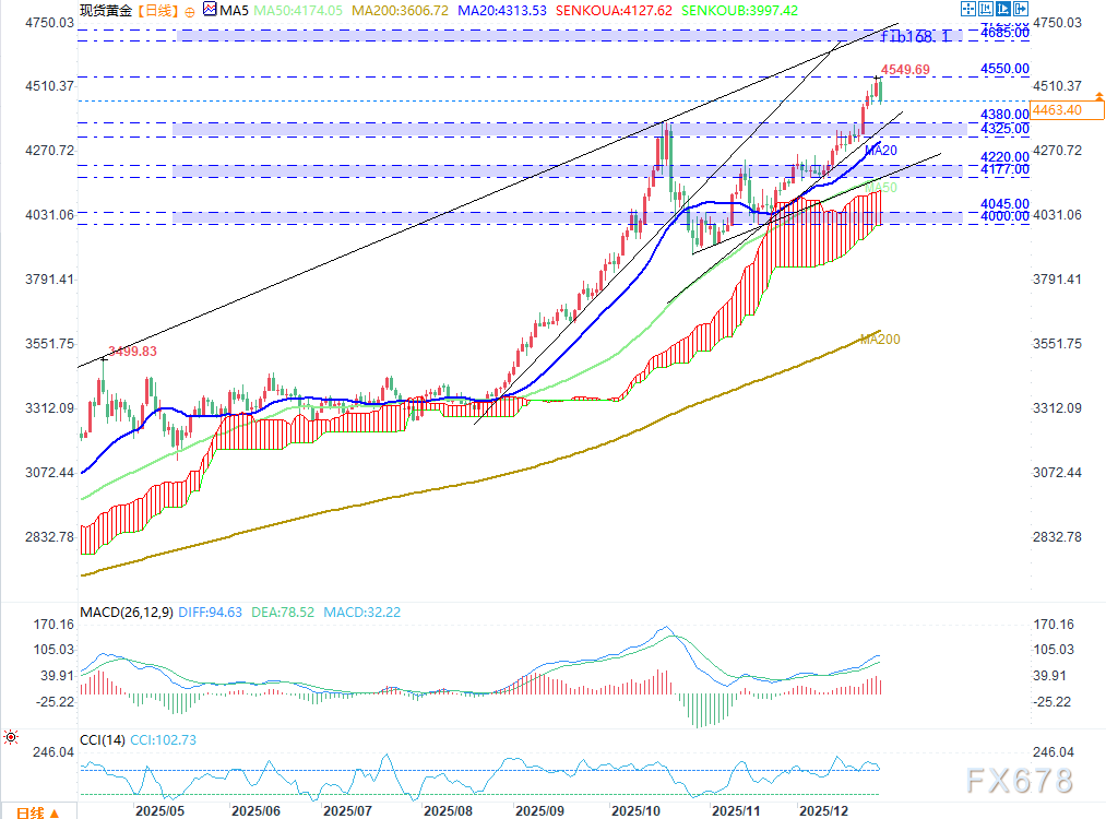 圣诞假期期间黄金走出一波强势上涨行情,价格冲高至4449美元的历史全新高点;而在周日,美国总统唐纳德.特朗普与乌克兰总统弗拉基米尔.泽连斯基于佛罗里达州举行面对面会晤,此次会谈释放出和平协议有望达成的积极信号,尽管双方并未公布任何具体协议细节与时间规划,受该消息影响,黄金自此开启回调走势。