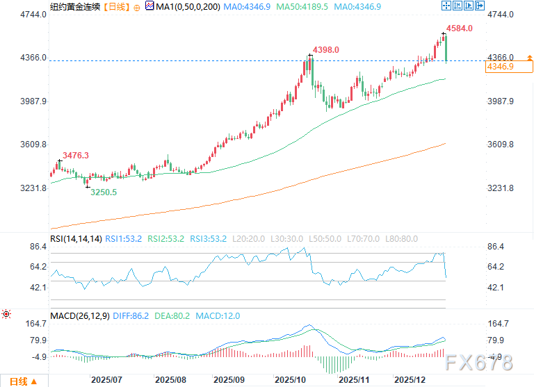 隔夜时段,COMEX(纽约商品交易所)3月交割的白银期货价格触及82.67美元/盎司的历史新高;而在上周五,2月交割的黄金期货价格也创下4584.00美元/盎司的历史峰值。2月黄金期货价格盘中下跌203.4美元,报4349.3美元/盎司;3月白银期货价格下跌6.87美元,报71.895美元/盎司。