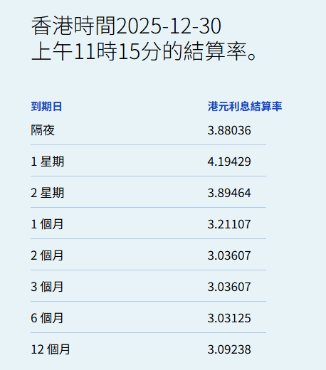 12月30日,港元拆息普遍向下,隔夜息报3.88036%,跌11.75基点;一周拆息跌26.476基点,报4.19429%,两周则跌7.167基点,报3.89464%。与楼按相关的一个月拆息终止两连升报3.21107%,跌13.953基点。