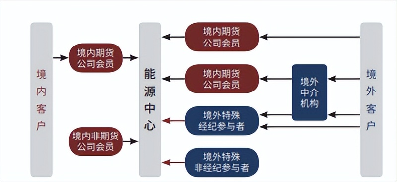 注:黑色箭头表明交易、结算、交割。红色箭头表明直接入场交易,但境外特殊参与者须通过境内期货公司 会员进行结算、交割。