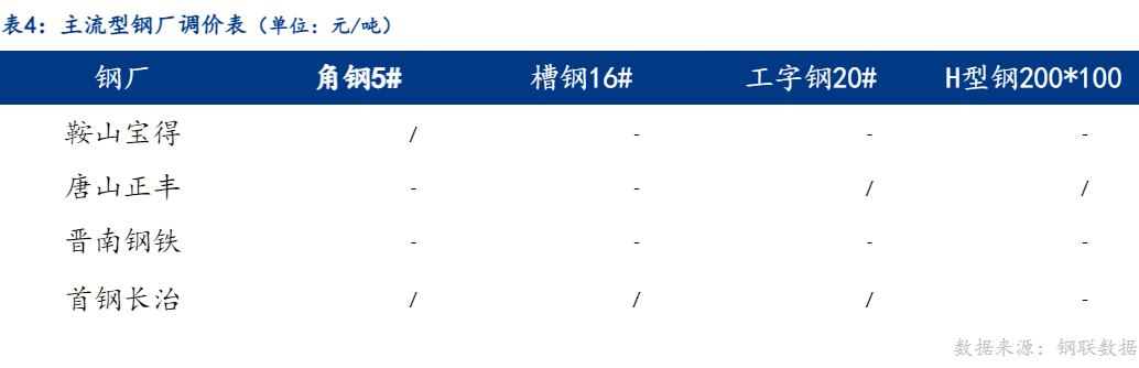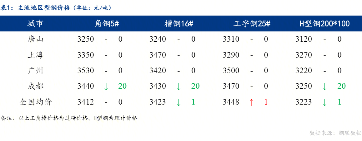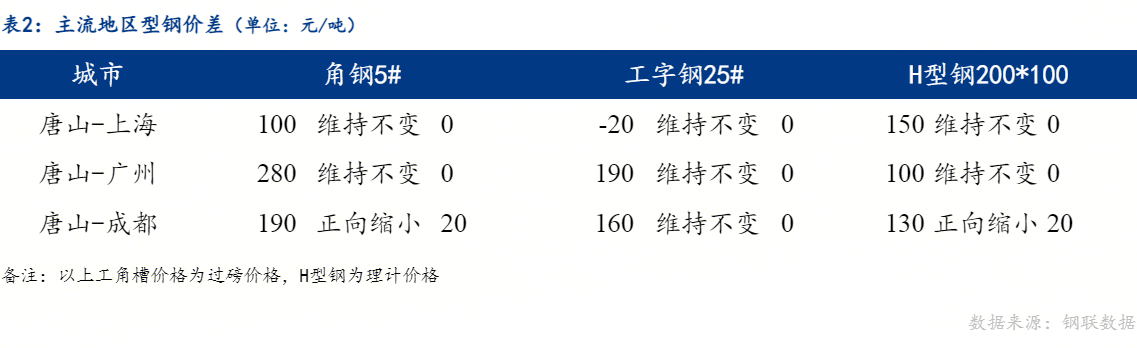 从区域价差来看,今日唐山与上海角钢、工字钢、H型钢价差维持不变,唐山与广州角钢、工字钢、H型钢价差维持不变,唐山与成都角钢、H型钢价差正向缩小,工字钢价差维持不变。