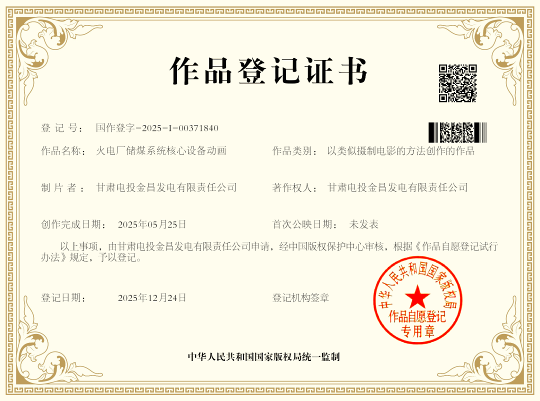 甘肃电投金昌发电公司《火电厂储煤系统核心设备动画》喜获国家版权局著作权认证