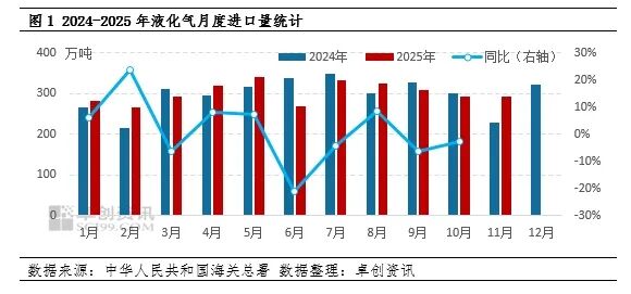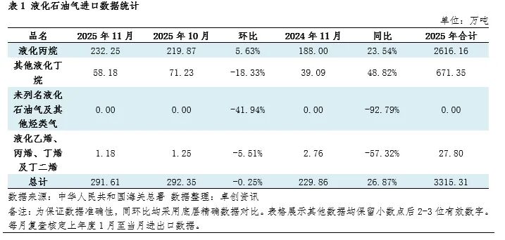 【LPG】11月进口量291.61万吨环比下降0.25%