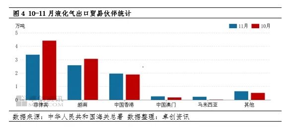 从不同税则号产品来看,11月进口液化丙烷232.25万吨,环比增长5.63,同比增长23.54%;进口其他液化丁烷共计58.18万吨,环比下降18.33%,同比增长48.82%;未列名液化石油气及其他烃类气、液化乙烯、丙烯及丁二烯进口量较少。