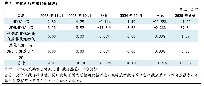 2025年累计进口3315.31万吨,同比增长2.10%。主要是受以下因素影响:其一,由于上半年中美贸易摩擦再起,市场对美国货源采购态度谨慎,叠加前期高关税影响美国货源进口量跌至低位,带动进口成本走低;其二,国际现货市场跌幅不及油价,液化气整体价格重心偏高,下游工厂追高意愿不强;其三,国内深加工亏损局面犹存,企业多按需择低采购,市场投机需求下降,需求支撑力度转弱。