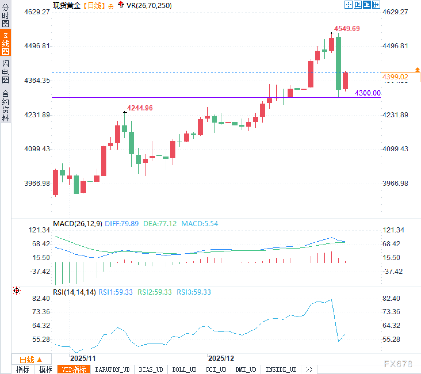 汇通财经APP讯——周二(12月30日),现货黄金在经历一轮冲高回落后重新企稳,北美时段交投4400美元附近。日线层面,价格先触及4549.69的阶段高点,随后出现明显的保证金驱动式去杠杆波动,快速回撤并在4300.00一线附近获得承接,当前则回到关键中枢区域,市场进入“消化波动、等待催化”的再平衡阶段。
