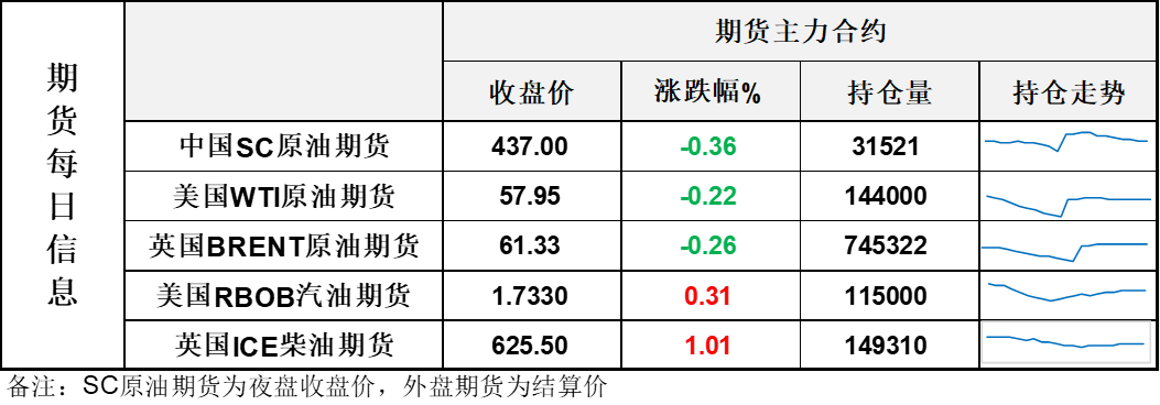 【1】WTI主力原油期货收跌0.13美元,跌幅0.22%,报57.95美元/桶;布伦特主力原油期货收跌0.16美元,跌幅0.26%,报61.33美元/桶;INE原油期货收跌0.36%,报437元。