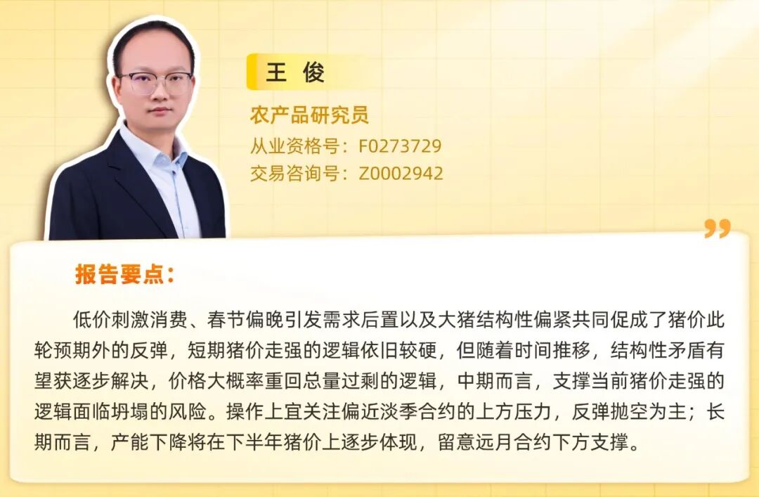 综上,低价刺激消费、春节偏晚引发需求后置以及大猪结构性偏紧共同促成了猪价此轮预期外的反弹,短期猪价走强的逻辑依旧较硬,但随着时间推移,结构性矛盾有望获逐步解决,价格大概率重回总量过剩的逻辑,中期而言,支撑当前猪价走强的逻辑面临坍塌的风险。操作上宜关注偏近淡季合约的上方压力,反弹抛空为主;长期而言,产能下降将在下半年猪价上逐步体现,留意远月合约下方支撑。
