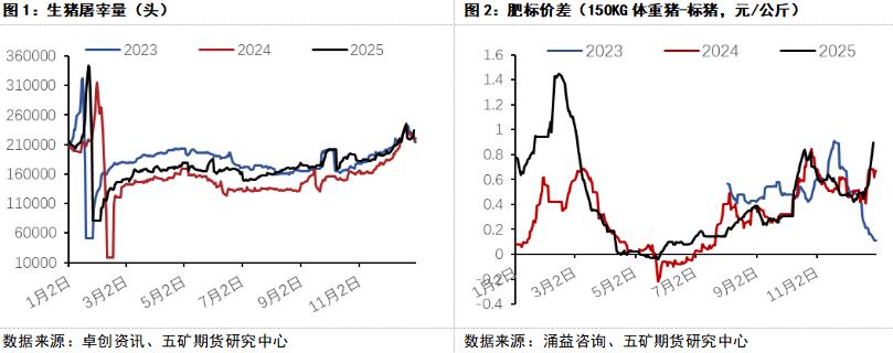 一是低价刺激了消费。考虑今年持续偏大的屠宰规模以及体重水平,冬至前低价极大的刺激了基础消费,导致冬至前预期的价格加速下行并未出现。二是暖冬及春节滞后效应。常年冬至前后气温偏低,适合腌腊进行,但今年春节偏晚,气温偏暖,前期屠宰尽管集中放量但并未完全在腌腊上兑现,冬至后南方腌腊规模依旧偏大,这导致年底屠宰端出现了二次放量(图1)。三是大猪偏紧加剧了结构性矛盾。国庆后市场对年底猪价预期偏悲观,在整体散户占比大幅下降的背景下,散户群体过度谨慎叠加近期的消费放量,导致年底大猪供应偏紧的结构性矛盾突显,并通过明显走高的肥标价差进一步传递至标猪市场,行业集中性的压栏和二育进一步抬升猪价。截止12月底,基准地河南地区生猪均价报12.7元/公斤,较一周前上涨1.02元/公斤,涨幅8.7%,肥标价差较一周前上涨0.36元至0.9元/公斤。