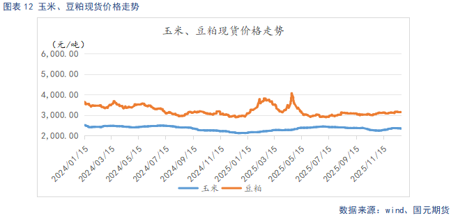 截至12月25日,玉米现货均价2338.04元/吨,较上月末环比上涨8.24元/吨,豆粕现货均价3143.71元/吨,较上月末环比上涨36.28元/吨。玉米从基本面上看,国内主产区玉米售粮节奏平缓,叠加进口拍卖持续及小麦拍卖预期,市场看空情绪升温,企业库存回升后,采购偏谨慎,玉米价格维持窄幅震荡格局。豆粕从基本面看,元旦前后油厂检修计划对现货形成一定支撑,但大豆整体供应充足,中储粮进口大豆拍卖持续,叠加油厂豆粕库存高企,共同压制价格上行空间。多空博弈加剧,预计短期豆粕市场呈现震荡格局。