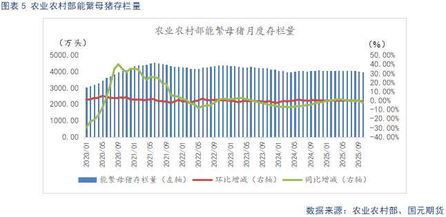根据农业农村部数据显示,2025年10月末全国能繁母猪存栏量3990万头,同比下降2.04%,环比下降1.1%。全国能繁母猪存栏量自2024年8月以来首次跌破4000万头整数关口,能繁母猪存栏已出现阶段性收缩迹象。不过由于前期基数较大,26年上半年依然处于产能兑现期,下半年供给压力有望逐步缓解。
