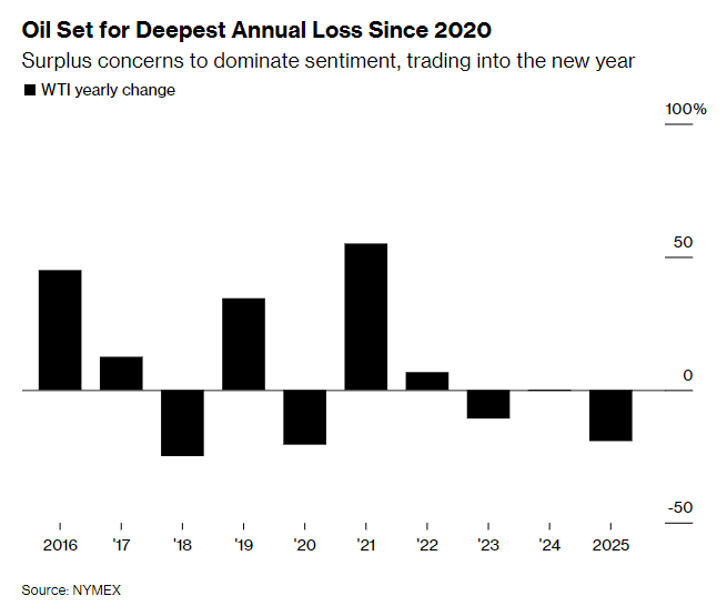 受市场对供应过剩的持续担忧拖累,国际油价正迈向2020年疫情爆发以来最严重的年度下跌。这一利空因素不仅主导当前市场情绪,还将对新一年的交易走势形成压制。