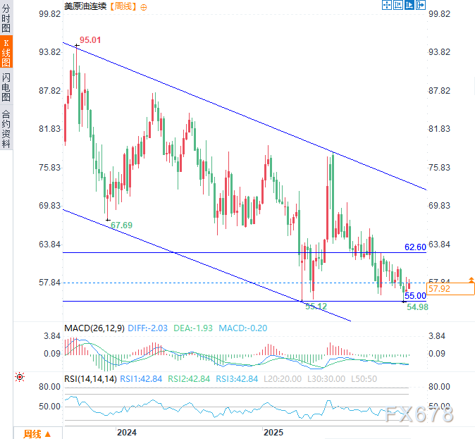 从技术面看,原油价格走势自2022年峰值以来始终受下降通道主导。其中2023年9月高点形成的结构更清晰的下降通道,正配合全球供应增长态势,持续将油价压制在60美元关口下方。