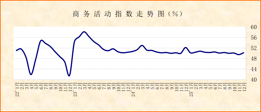 国家统计局服务业调查中心、中国物流与采购联合会发布的2025年12月份中国非制造业商务活动指数为50.2%,较上月上升0.7个百分点;新订单指数虽仍在50%以下,但较上月上升1.6个百分点,升至47.3%,创出今年以来新高。数据变化显示,非制造业经营活动增速较上月有所加快,重回扩张区间,需求侧虽仍在收缩区间,但也出现向好转变的迹象。在供需向好的带动下,企业市场预期持续升温,业务活动预期指数为56.5%,较上月上升0.3个百分点,连续3个月环比上升,连续3个月稳定在56%以上。细分指数变化显示,投资相关活动加速启动,金融支持实体经济力度持续增强,新动能发展态势持续活跃。