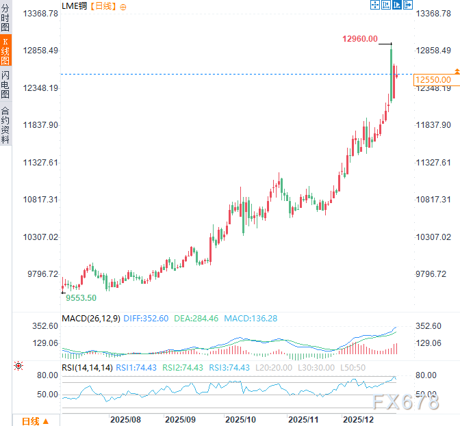 伦敦金属交易所(LME)铜价格周三(12月31日)亚市时段于12540美元/吨附近宽幅震荡。29日铜价一度触及12960美元的历史高点,但因投资者获利了结大幅回落,但铜价仍处于历史相对较高位。