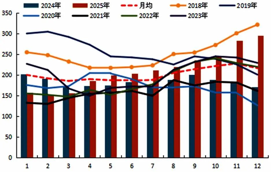 2025年12月10日,马来西亚棕榈油局发布11月供需报告,11月马棕产量环比下降5.3%,至193.6万吨,减幅低于历年同期均值-8.79%,尽管11月部分地区出现洪涝,但实际影响有限。