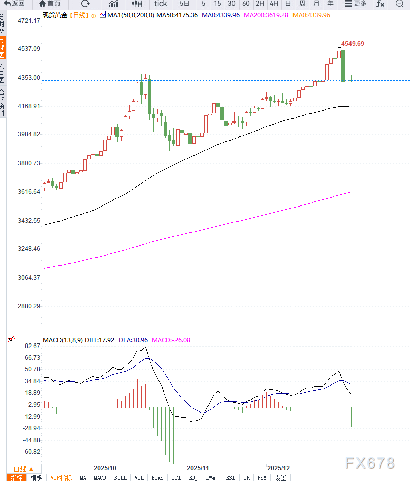 上方初步阻力位位于4520美元(布林带上轨),若有效突破,金价有望测试4550美元历史高位,并进一步指向4600美元心理关口。下方支撑关注4300美元区间,若回调加深,或下探4271美元附近。